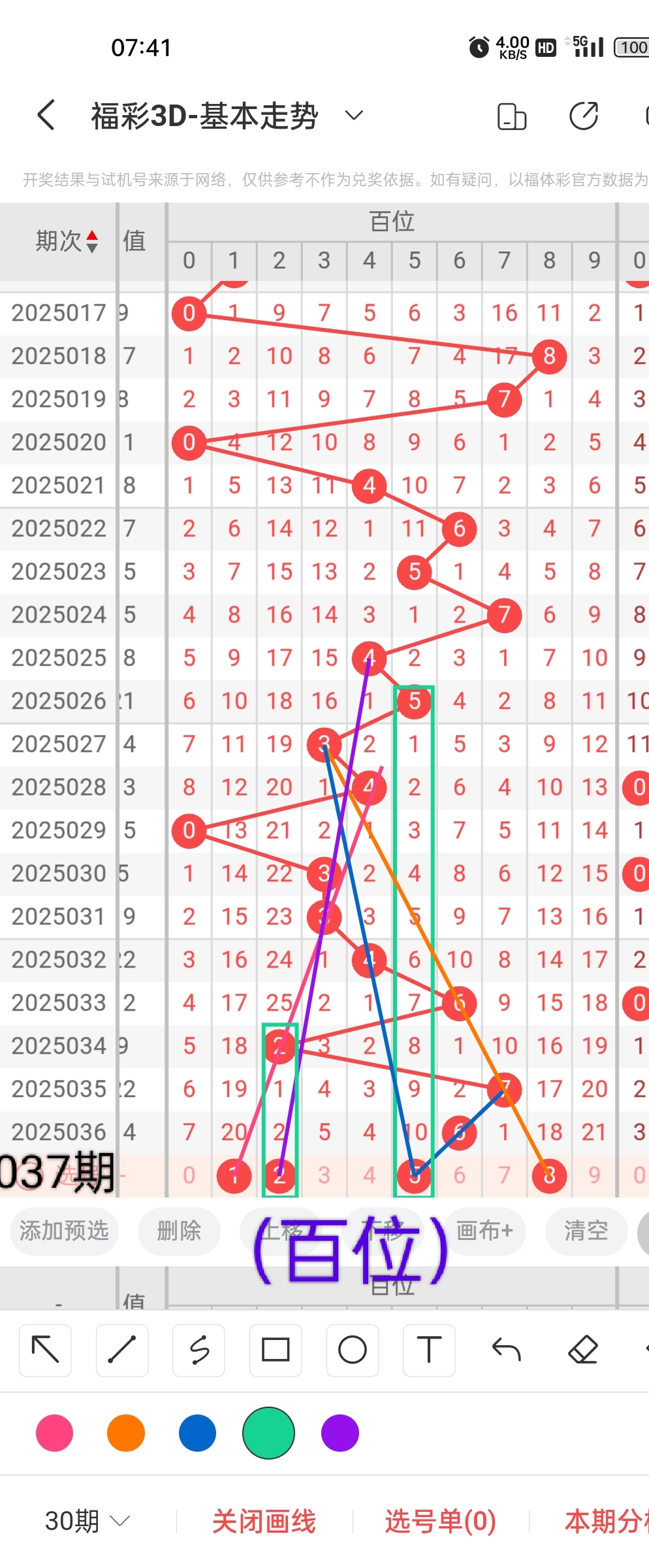 首先,小梁给大家分享一个福彩3D杀百位的小技巧,本期尾号乘以3加3后取个位杀本期百位,准确率高达95.36%。根据这个小技巧,本期杀百位:7。其次,我们根据图中画线的思路可以看出,遗落20期未出的号码1与前几期开出的号码呈斜四连的走位,跨度为5;号码2与前几期开出的号码呈斜三连的走位且呈隔两期回补的走势,跨度为4;号码5与前几期开出的号码呈隔十期回补的走势且呈两条左右斜三连的走位,跨度为1。然后,如图所示,遗落18期未出的号码8与前几期开出的号码呈斜四连的走势,跨度为2。综上所述,小梁预测百位开出的号码为1、2、5、8。