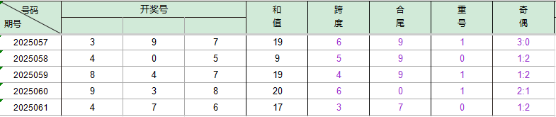 2025057期开奖号码397,我们可以看出近30期百位3出现2次(较61期减2),十位9出现6次(较59期减一位),个位7出现4次。
