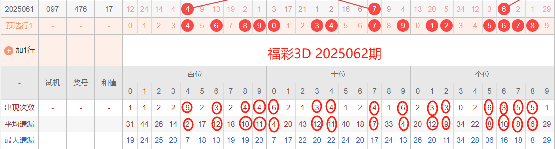 2025061期开奖号码476,我们可以看出近30期百位4出现9次,十位7出现4次,个位6出现3次。