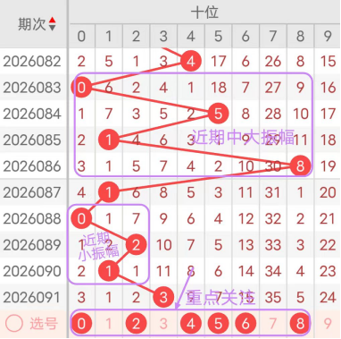 近7期(085~091)开奖号十位号码球分别为1、8、1、0、2、1、3,开奖号与上一期走出的振幅分别为4、7、7、1、2、1、2。085期走出1号小数号码球,走出“4”的中小幅度,086期走出8号大数号码球,走出“7”的大幅度,087期走出1号小数号码球,走出“7”的大幅度,088期走出0号小数号码球,走出“1”的小幅度,089期走出0号小数号码球,走出“2”的小幅度,090期走出1号小数号码球,走出“1”的小幅度,091期走出3号中小数号码球,走出“2”的小幅度;从振幅大小及走势图的整体对应来看,中大振幅走在3~5之间较为适宜,中小振幅走在1~2之间较为适宜;结合走势图的上下对应及振幅大小分析,本期十位应重点关注号码球为0、2、4、5、6、8。