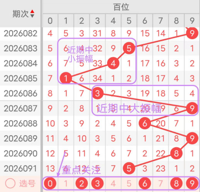 近7期(085~091)开奖号百位号码球分别为1、3、9、6、9、8、5,开奖号与上一期走出的振幅分别为3、2、6、3、3、1、3。085期走出1号小数号码球,走出“3”的中小幅度,086期走出3号中小数号码球,走出“2”的小幅度,087期走出9号大数号码球,走出“6”的中大幅度,088期走出6号中大数号码球,走出“3”的中小幅度,089期走出9号大数号码球,走出“3”的中小幅度,090期走出8号大数号码球,走出“1”的小幅度,091期走出5号中大数号码球,走出“3”的中小幅度;从振幅大小及走势图的整体形势,中大幅度走在4~5之间较为适宜,中小幅度走在1~3之间较为适宜;结合走势图的整体及大小走势分析,本期百位需重点关注号码球为0、2、3、6、8、9。