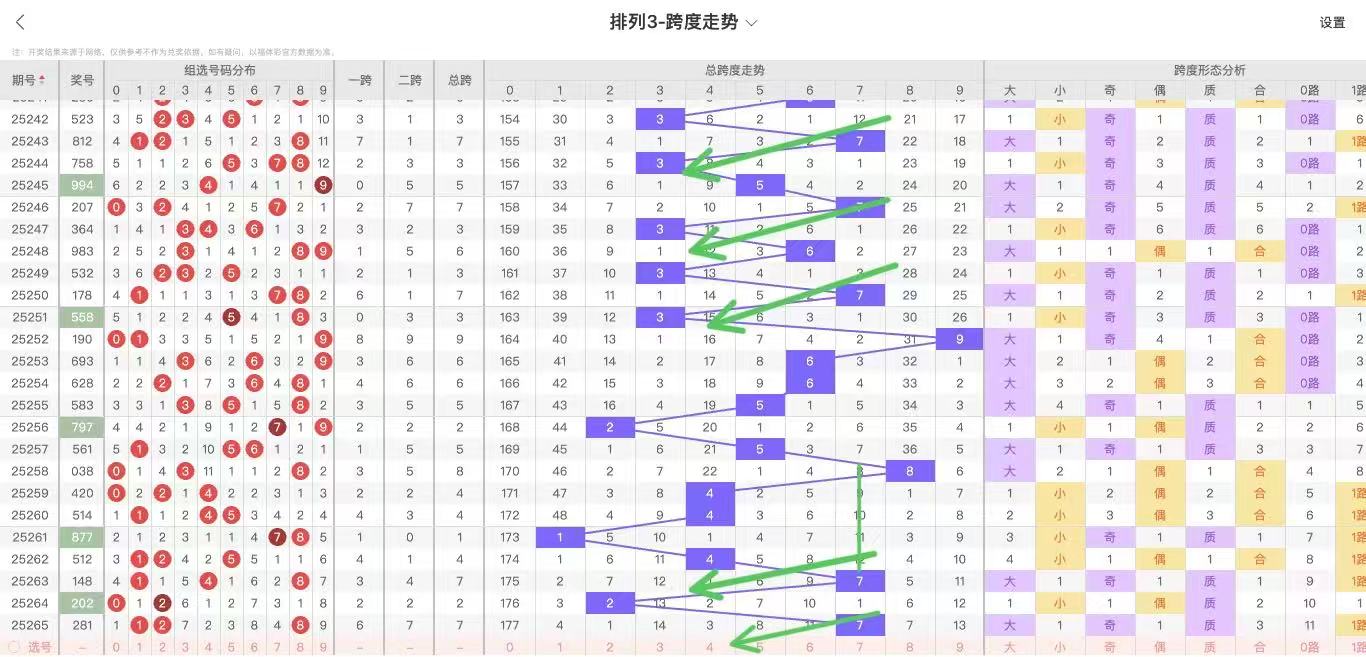 266期体彩P3跨度走势图如下:根据走势对跨度观察统计得到以下分析结果: