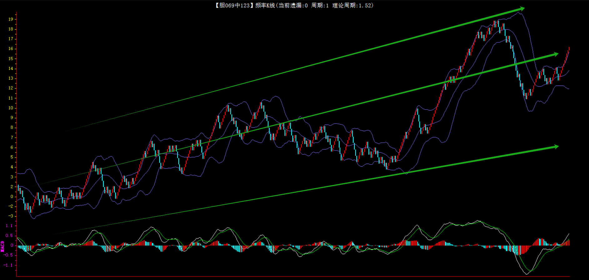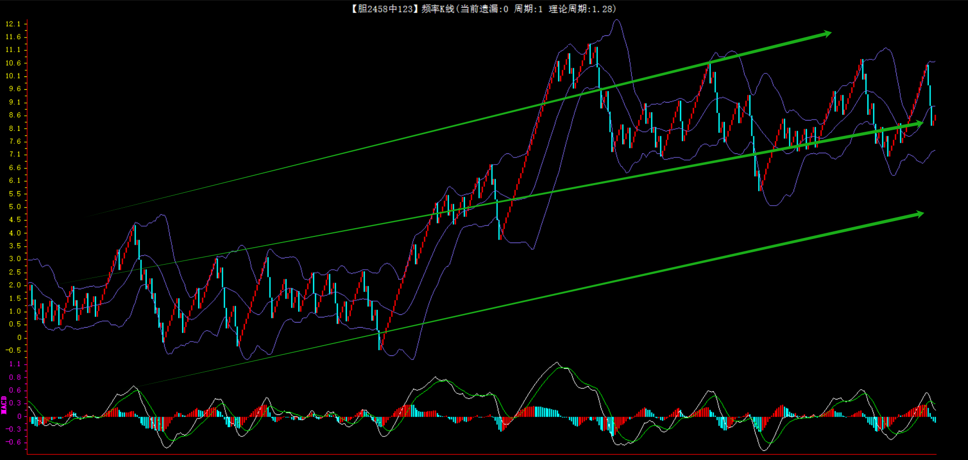 整体趋势下行,上边沿线趋势向下,下边沿趋势也是向下,节点震荡,当前遗漏1期,本期防守。