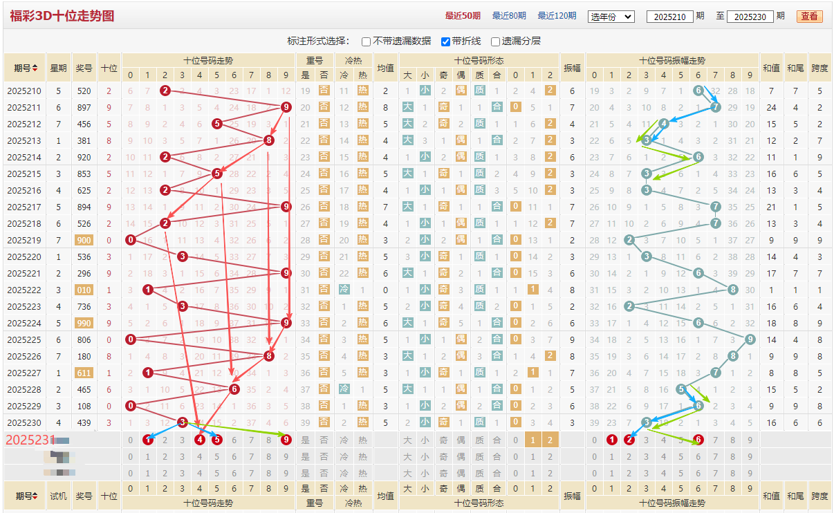 十位近期走势:9-1-3-9-0-8-1-6-0-3,0路号码(0/3/6/9)占比70%,从012路看000-1-000-21-000,本期就看12路排除0路,数字4遗漏25期本期需要重点关注,大家看红色箭头9-8-5-2再看9-8-6-4是不是同样的走势,再看右边振幅走势对应号码159,遗漏37期的7好球可关注,十位推荐:14579