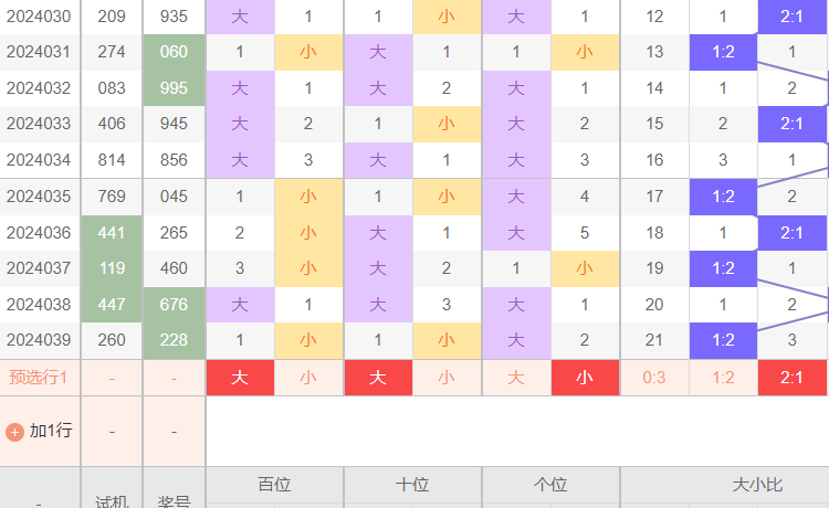2:如图所示,2大一小走势.个位的走势已连出2,十位已出1,百位已出1小.比例为1:2.本期给出的推测还是两大一.个位小码:01234.十位大码:56789,百位大码:56789.这是给出的范围.下面通过其他走势缩小范围.