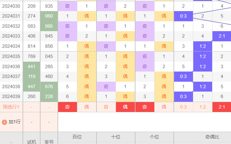 3:如图所示数据,上期开出0奇3偶,个位为偶,连开3.十位为偶,开1.百位为偶,连开6.比例0:3.本期推测21,个位为奇,13579.十位为偶,24680,百位为奇,13579.结合下大小分析进行缩小,