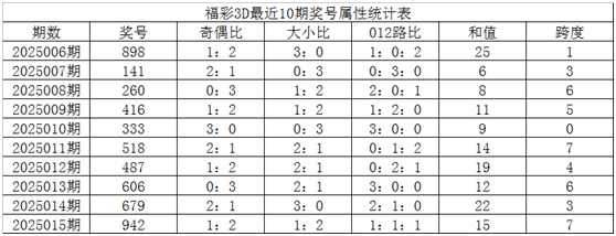 跨度分析:最近10期跨度走势为:(1)、(3)、(6)、(5)、(0)、(7)、(4)、(6)、(3)、(7),跨度升降平次数比为5:5:0,上期跨度升高4点。