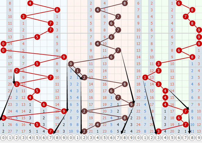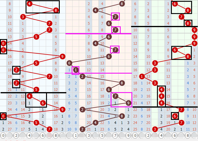 个位:个位上的小号在连续出现7期之后,近4期开出大号以后又开出小号,从图上趋势线来观察,本期个位开大号的可能性很高,并重点关注在小号7-8号球
