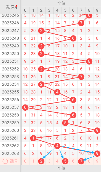 现在我给大家分析下,本期个位可能开出的号码,上期开出了9,251期开出了8号码球,252期开出了2号码球,253期开出了7号码球,254期开出了2号码球,255期开出了4号码球,256期开出了6号码球,257期开出了0号码球,258期开出了6号码球,259期开出了5号码球,260期开出了9号码球,261期开出了1号码球,262期开出了4号码球,263期开出了9号码球,跟据这几期的走势和历史30期内的走势对比,可以先考虑本期可能会出大号,下面我给大家推存个位可能开出的几个号,个人比较看好257,个位我们就先暂定这两个号。本期重点关注1-7之间的号码,同时关注遗漏期数较大的号码。按最近遗漏走势,开了遗漏期数较大之后开遗漏期数小的可能性比较大。
