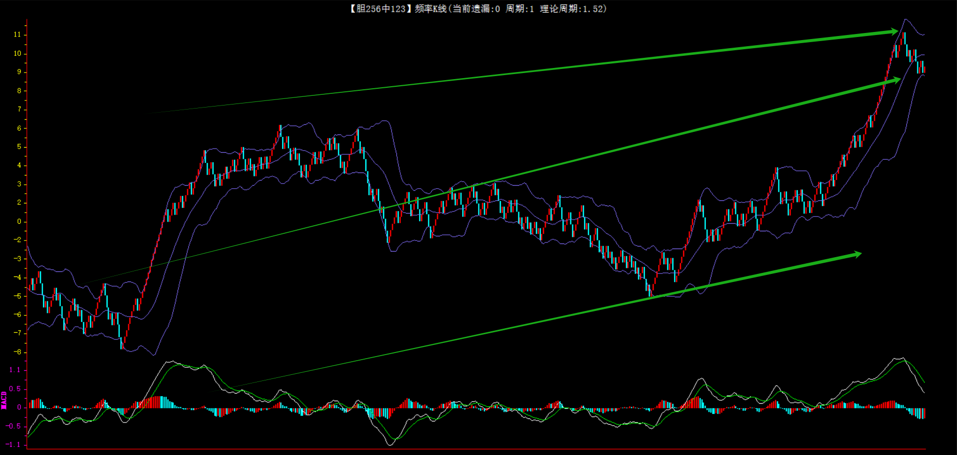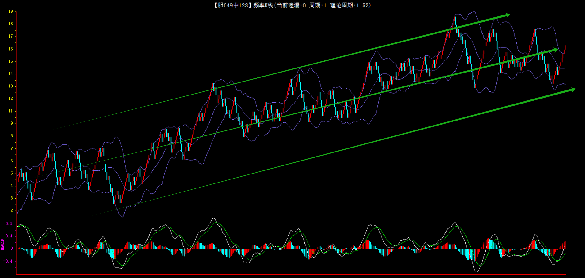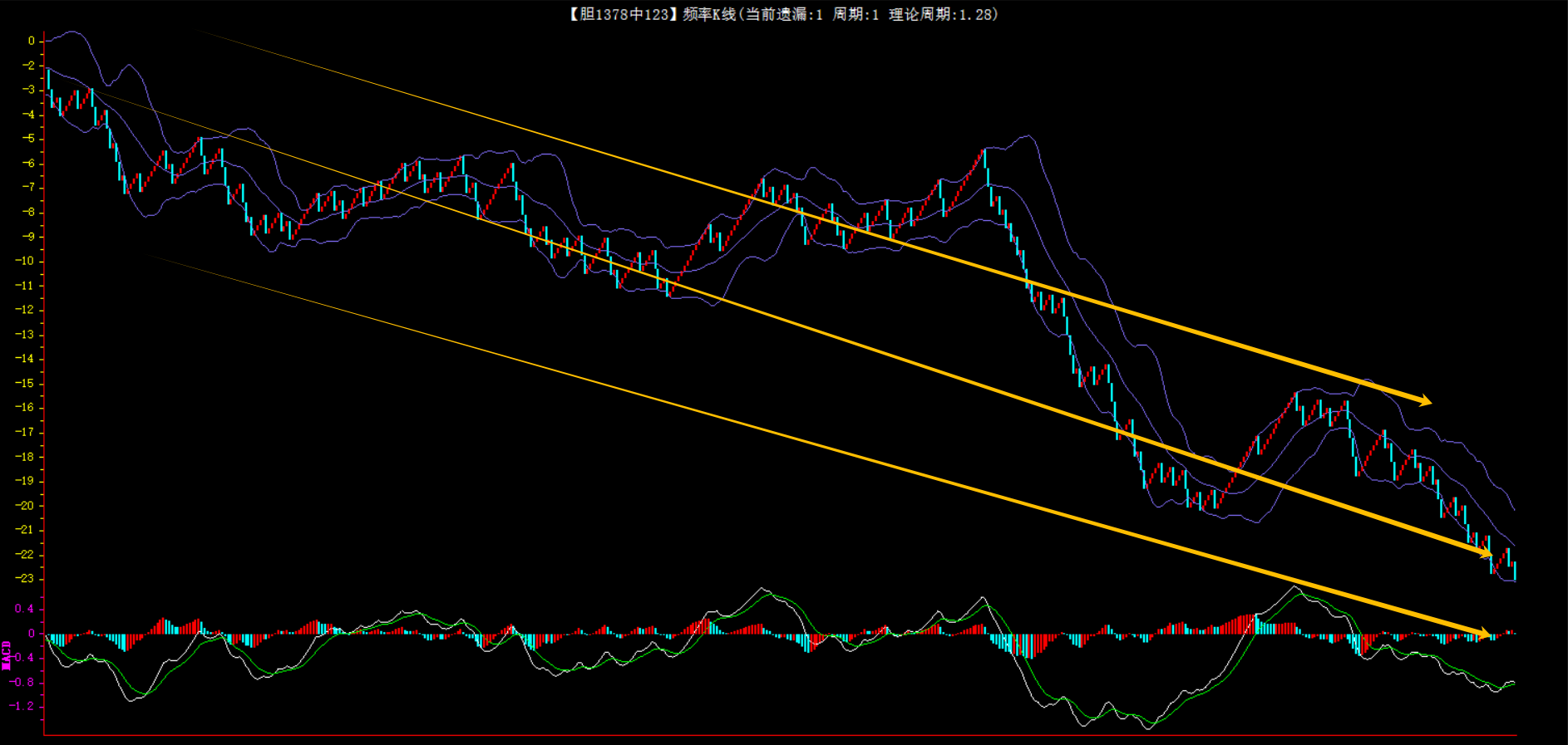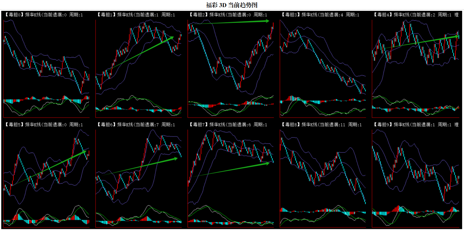整体趋势下行,上边沿线趋势向下,下边沿趋势也是向下,节点震荡,当前遗漏1期,本期防守。
