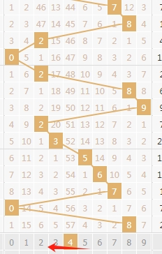 上图是福彩3D开奖号码走势分布图,我在上面走势图中标注出来的数字3456这个区域已经连续两期没出现过号码,最近4期这个区域也只出现了一个数字5,那么本期可以关注这个区域的数字至少出一个或者两个吧。