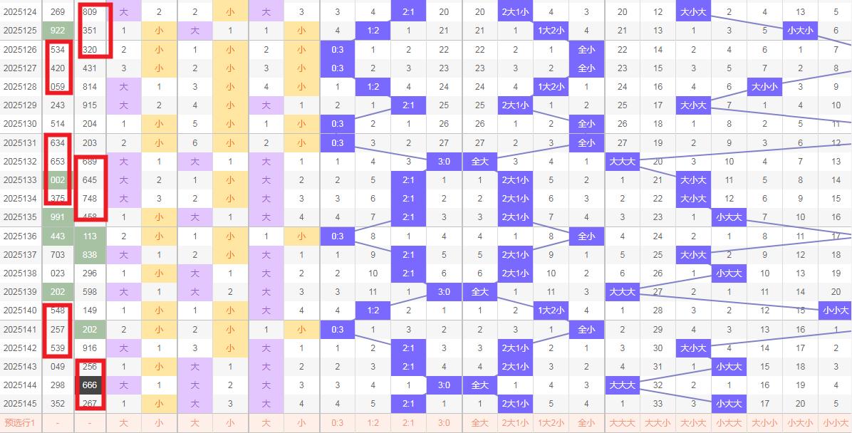 大小走势分析 - 大小比:上期开奖号码呈现小大大形态,即第一位小、第二位大、第三位大。综合近期大小号的波动趋势,建议本期重点关注大小比为1:2的组合,即预测两位小号搭配一位大号。
