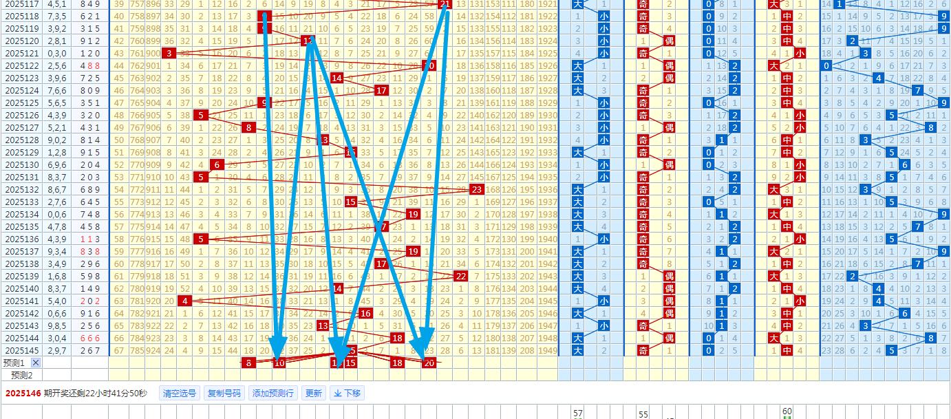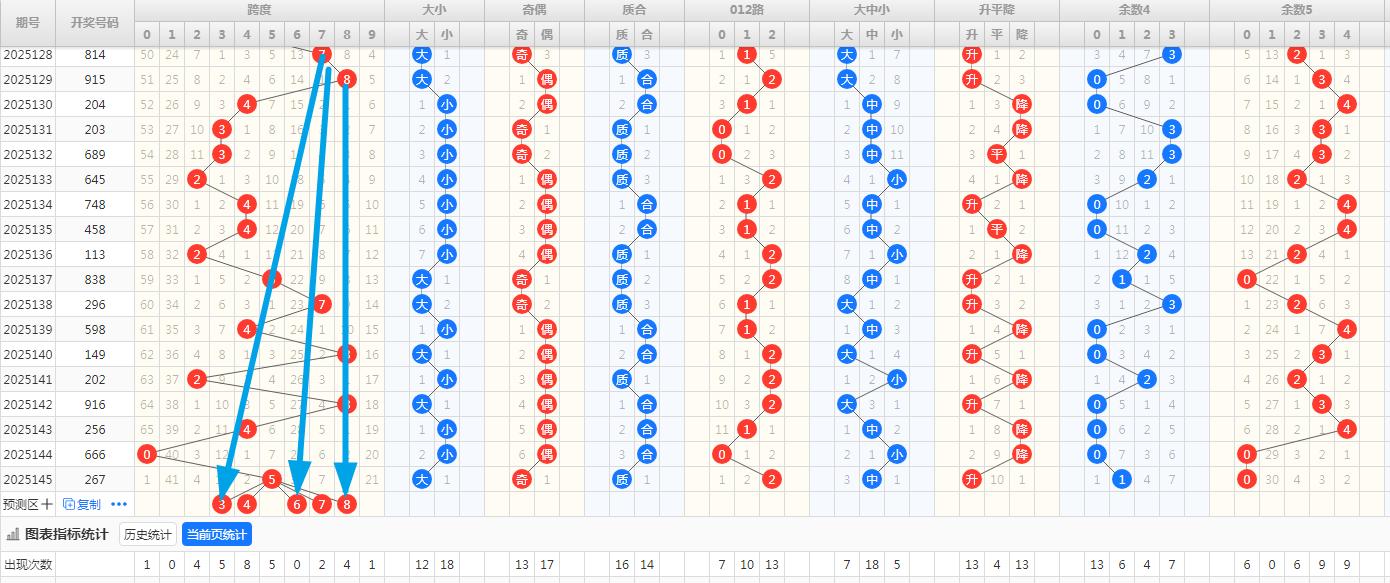 跨度预判 - 跨度:上期跨度为5,属于中跨度范畴。根据历史跨度数据的统计结果,近期大跨度与小跨度的比例约为4:6,小跨度更为频繁。因此,本期建议关注大跨度3、4、6、7、,特别是跨度4和7等数值。