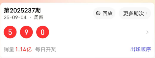 2025237期开奖号码为590,奇偶值为21偶;大小值为21小;012路走势为002路;跨度为9跨;和值14点;组六形态。