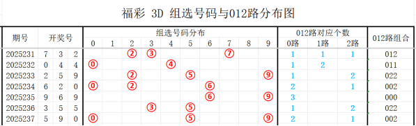 012路定义:0路为0369,1路为147,2路为258。请看开奖号对应012路分布图: