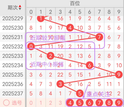 7期(231~237)开奖号百位号码球分别为7、0、2、6、9、3、5,开奖号与上一期走出的振幅分别为3、7、2、4、3、6、2,231期走出7号大数号码球,走出“3”的中小幅度,232期走出0号小数号码球,走出“7”的大幅度,233期走出2号小数号码球,走出“2”的小幅度,234期走出6号中大数号码球,走出“4”的中小幅度,235期走出9号大数号码球,走出“3”的中小幅度,236期走出3号中小数号码球,走出“6”的中大幅度,237期走出5号中大数号码球,走出“2”的小幅度;从振幅大小及走势图的整体形势,中大幅度走在3~4之间较为适宜,中小幅度走在0~2之间较为适宜;结合走势图的整体及大小走势分析,本期百位需重点关注号码球为4、5、6、7、8、9