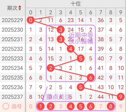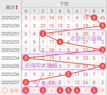 7期(231~237)开奖号个位号码球分别为2、4、9、0、9、5、0,开奖号与上一期走出的振幅分别为7、2、5、9、9、4、5,231期走出2号小数号码球,走出“7”的大幅度,232期走出4号中小数号码球,走出“2”的小幅度,233期走出9号大数号码球,走出“5”的中大幅度,234期走出0号小数号码球,走出“9”的大幅度,235期走出9号大数号码球,走出“9”的中大幅度,236期走出5号中大数号码球,走出“4”的中小幅度,237期走出0号小数号码球,走出“5”的中大幅度;从近期振幅大小的走势及大小走势来看,中大振幅走在5~8之间较为适宜,中小振幅走在0~4之间较为适宜;结合走势图的整体及大小走势分析,本期个位应重点关注号码球为0、2、4、5、6、8