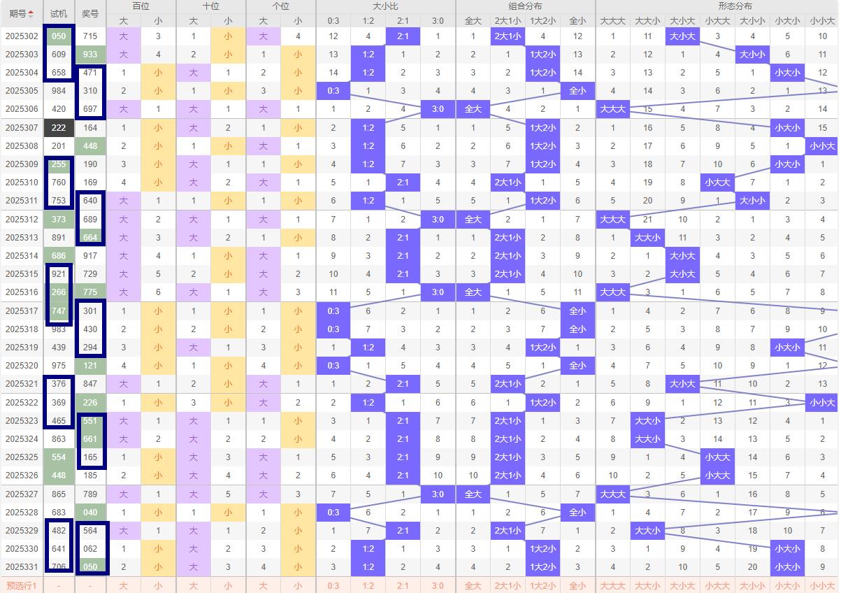 大小走势分析 - 大小比:331期开奖号码050呈现小大小形态,综合近期大小号的波动趋势,建议本期重点关注大小比为2:1或1:2的组合。