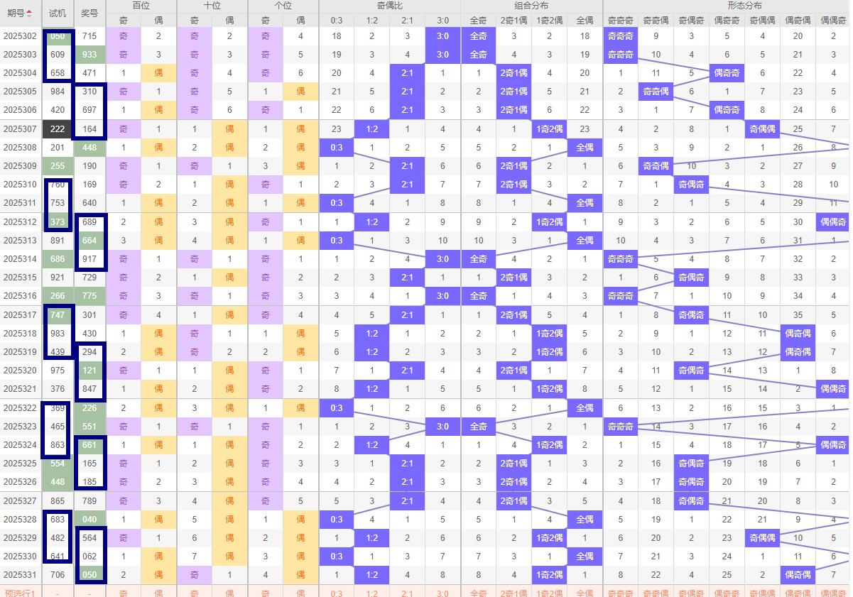 奇偶比例分析 - 奇偶比:331期号码050为偶奇偶形态,奇偶比例为1:2。结合历史数据与近期走势特征,本期可倾向于奇偶比为2:1的组合,即预测两位奇数搭配一位偶数。近十期奇偶比为12:18关注两奇一偶号码