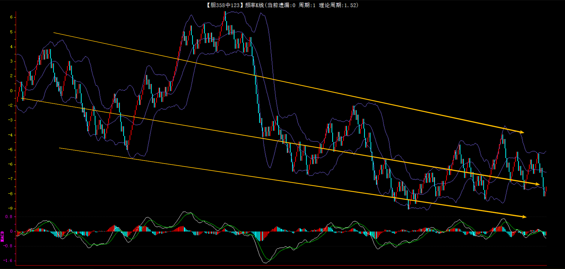 整体趋势下行,上边沿线趋势向下,下边沿趋势也是向下,节点震荡,当前连开2期,本期防守。