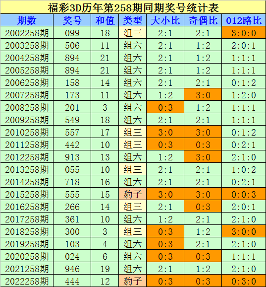 在第258期历史同期开奖中,组六开出13次,占比为62%,组三开出6次,占比为29%,豹子开出2次,目前组六遗漏1年没有出现,今年同期注意组六回补。