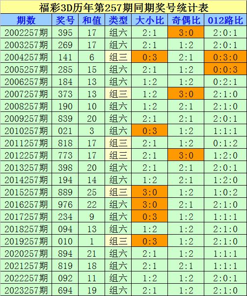 福彩3D第2023257期奖号为694,奖号类型为组六,大小比为2:1,奇偶比为1:2,012路比为2:1:0。