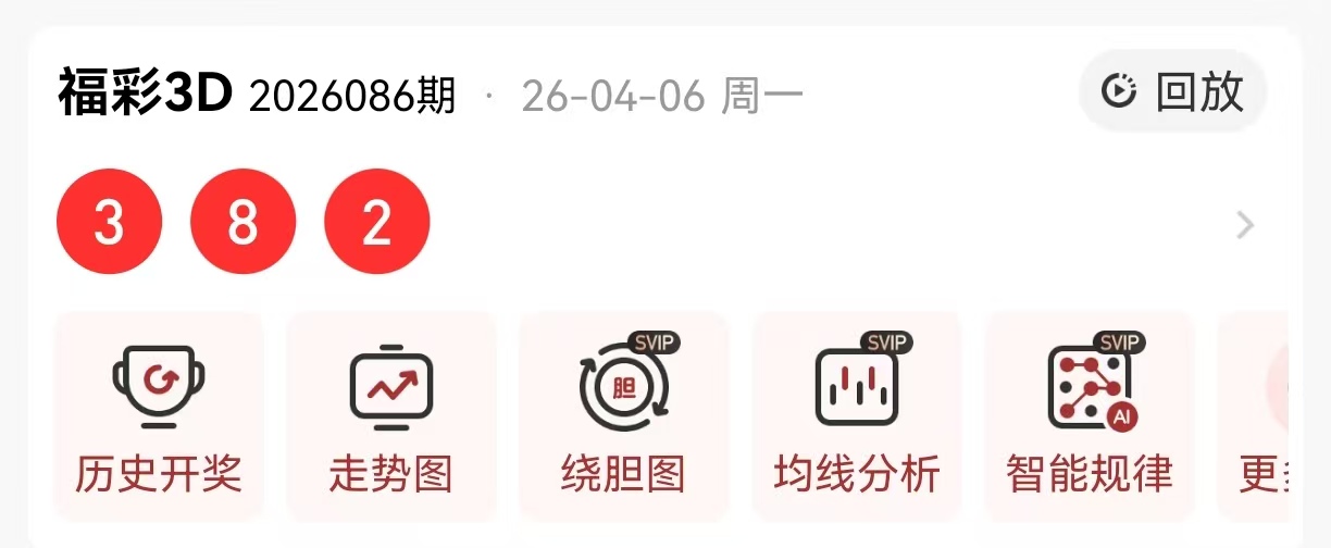 福彩3D 086期开奖号码382,和值13,跨度6,大小1:2,奇偶比1:2,形态:组六