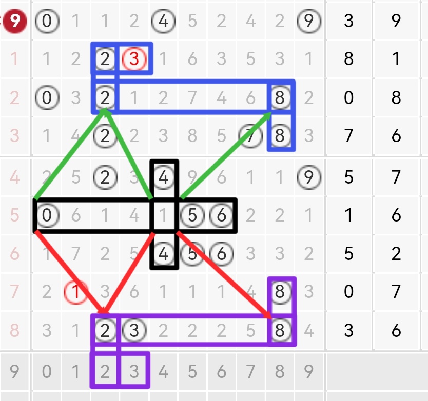 黑色图为中心:向上格方向出4,回上8落8开28组合在落2开23全小组三,向下格出4,回下8落8开28组合,判断28组合落087期分析落23全小组三同一形态方向