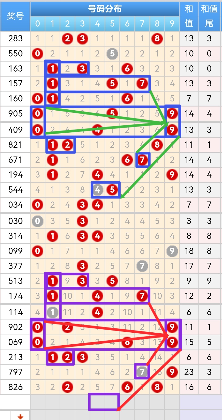 蓝色图:13组合落17组合,回落1形成落三个一,在落09 09两次组合,再开12组合回2的对码7在空一格开45组合组三,开5的时候形成9空格7空格5,紫色图与蓝色图同样开出13组合落17组合,回落1形成落三个一,在落09 09两次组合,再开12组合回2的对码7,接下来判断087期历史分析如果要是开相同就是形成9空格7空格5出现975奇数差2,当开5时出现组三