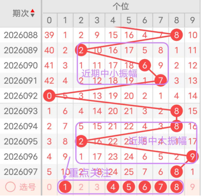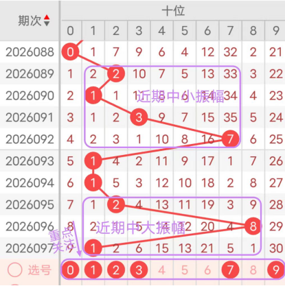近7期(091~097)开奖号十位号码球分别为3、7、1、1、2、8、1,开奖号与上一期走出的振幅分别为2、4、6、0、1、6、7。091期走出3号中小数号码球,走出“2”的小幅度,092期走出7号大数号码球,走出“4”的中小幅度,093期走出1号小数号码球,走出“6”的中大幅度,094期走出1号小数号码球,走出“0”的小幅度,095期走出2号小数号码球,走出“1”的小幅度,096期走出8号大数号码球,走出“6”的中大幅度,097期走出1号小数号码球,走出“7”的大幅度;从振幅大小及走势图的整体对应来看,中大振幅走在6~8之间较为适宜,中小振幅走在0~2之间较为适宜;结合走势图的上下对应及振幅大小分析,本期十位应重点关注号码球为0、1、2、3、7、9。