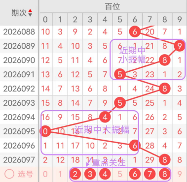近7期(091~097)开奖号百位号码球分别为5、8、5、4、0、6、8,开奖号与上一期走出的振幅分别为3、3、3、1、4、6、2。091期走出5号中大数号码球,走出“3”的中小幅度,092期走出8号大数号码球,走出“3”的中小幅度,093期走出5号中大数号码球,走出“3”的中小幅度,094期走出4号中小数号码球,走出“1”的小幅度,095期走出0号小数号码球,走出“4”的中小幅度,096期走出6号中大数号码球,走出“6”的中大幅度,097期走出8号大数号码球,走出“2”的小幅度;从振幅大小及走势图的整体形势,中大幅度走在4~6之间较为适宜,中小幅度走在0~2之间较为适宜;结合走势图的整体及大小走势分析,本期百位需重点关注号码球为2、3、4、6、7、8。