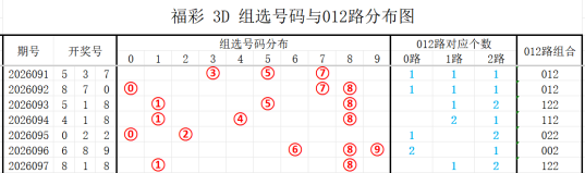 近7期(091~097)开奖号与012路组合分别为537(012)、870(012)、518(122)、418(112)、022(022)、689(002)、818(122),上期开奖号为122路组合,根据整体走势分析,本期看好的012路组合有:012、011、112,防022、002、111组合。