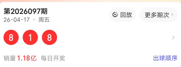 2026097期开奖号码为818,奇偶值为2偶1奇;大小值为2大1小;012路走势为122路;跨度为7跨;和值17点;组三形态。
