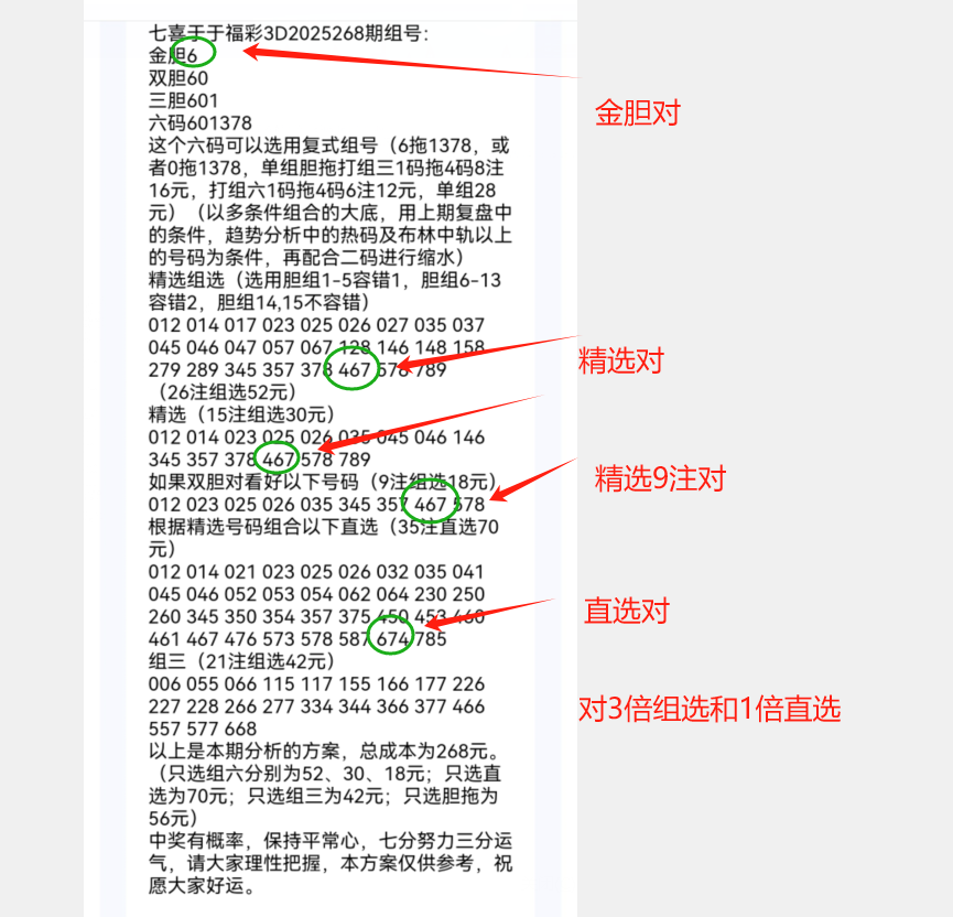 上期“会员专区”文章分析,金胆对、精选9注对、直选对,对3倍组选和1倍直选,综合奖金1559元。