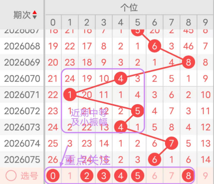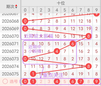 7期(069~075)开奖号十位号码球分别为0、8、6、4、0、8、1,开奖号与上一期走出的振幅分别为0、8、2、2、4、8、7。069期走出0号小数号码球,走出“0”的小幅度,070期走出8号大数号码球,走出“8”的大幅度,071期走出6号中大数号码球,走出“2”的小幅度,072期走出4号中小数号码球,走出“2”的小幅度,073期走出0号小数号码球,走出“4”的中小幅度,074期走出8号大数号码球,走出“8”的大幅度,075期走出1号小数号码球,走出“7”的大幅度;从振幅大小及走势图的整体对应来看,中大振幅走在5~8之间较为适宜,中小振幅走在0~3之间较为适宜;结合走势图的上下对应及振幅大小分析,本期十位应重点关注号码球为0、1、4、6、7、9