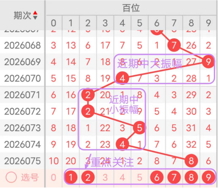7期(069~075)开奖号百位号码球分别为9、4、2、2、5、4、8,开奖号与上一期走出的振幅分别为2、5、2、0、3、1、4。069期走出9号大数号码球,走出“2”的小幅度,070期走出4号中小数号码球,走出“5”的中大幅度,071期走出2号小数号码球,走出“2”的小幅度,072期走出2号小数号码球,走出“0”的小幅度,073期走出5号中大数号码球,走出“3”的中小幅度,074期走出4号中小数号码球,走出“1”的小幅度,075期走出8号大数号码球,走出“4”的中小幅度;从振幅大小及走势图的整体形势,中大幅度走在6~7之间较为适宜,中小幅度走在0~2之间较为适宜;结合走势图的整体及大小走势分析,本期百位需重点关注号码球为1、2、6、7、8、9