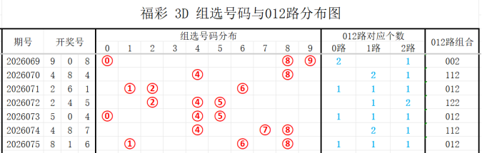 7期(069~075)开奖号与012路组合分别为908(002)、484(112)、261(012)、245(122)、504(012)、487(112)、816(012)上期开奖号为012路组合,根据整体走势分析,本期看好的012路组合有:001、002、012,112、122、022组合。