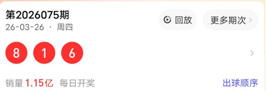 2026075期开奖号码为816,奇偶值为12偶;大小值为21小;012路走势为012路;跨度为7跨;和值15点;组六形态。