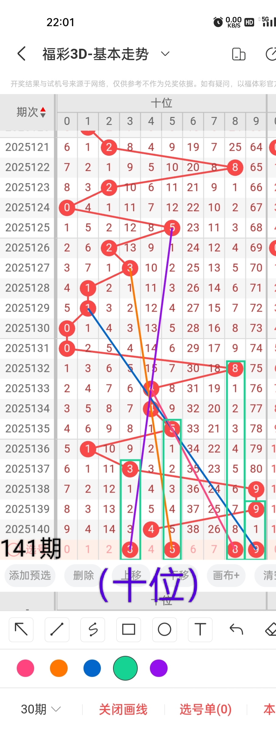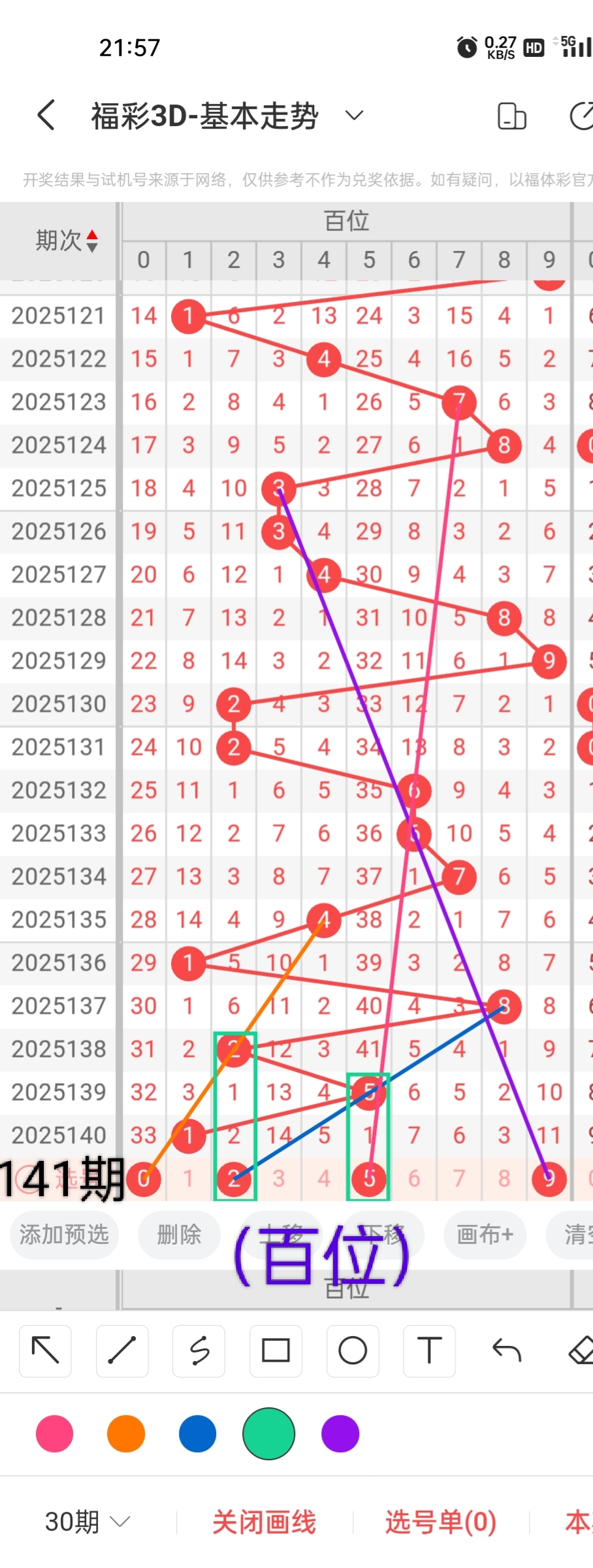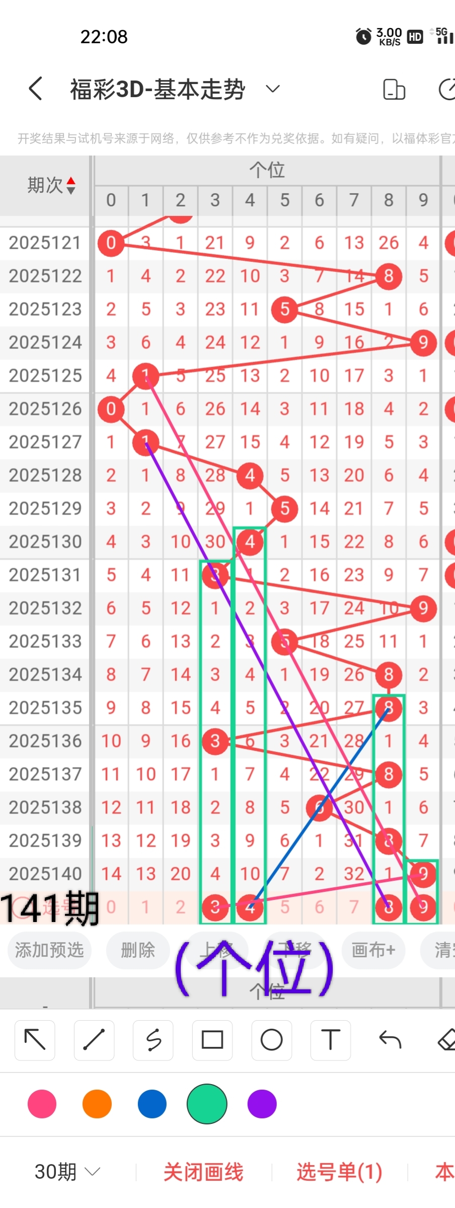 首先,小梁为了感谢各位老板的关注和打赏,特提供一个杀个位的小技巧,同尾杀号法,准确率相当高。根据同尾杀号法,得知本期杀个位1。其次,我们根据图中画线的思路可以看出,号码3与前几期开出的号码呈斜连的走位且呈连续隔四期回补的走势,跨度为6;号码4与前几期开出的号码呈斜三连的走势且呈隔十期回补的走位,跨度为5;号码8与前几期开出的号码呈斜三连的走位且呈连续隔期回补的走势,跨度为1;号码9与前几期开出号码呈斜四连的走势且呈直连回补的走位,跨度为0。综上所述,小梁依据图中画线思路预测个位开出的号码为3、4、8、9。