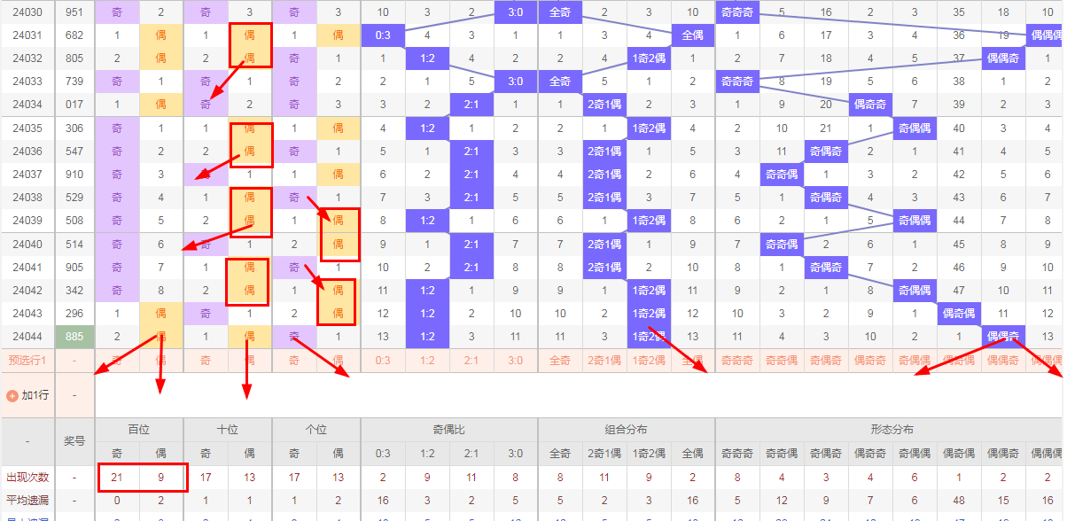 排列三 奇偶分析:从上图可以看出排列三100期内百位奇偶比为56比44,十位奇偶比为44比46,个位奇偶比为53比47.十位的比值比较均衡,但是百位的比值偏差就有点大,历史奇偶形态近3期开出偶偶奇形态后下一期的走势为,第010期开出偶偶奇 后第011期开偶偶偶, 第012期开出偶偶奇 后第013期开偶奇偶, 第032期开出偶偶奇 后第033期开奇奇奇。本期应该重点关注奇偶偶所以排列三第045期奇偶形态推荐2偶1奇。防全偶.本文由一起彩作者钱是生命动力所著请勿抄袭