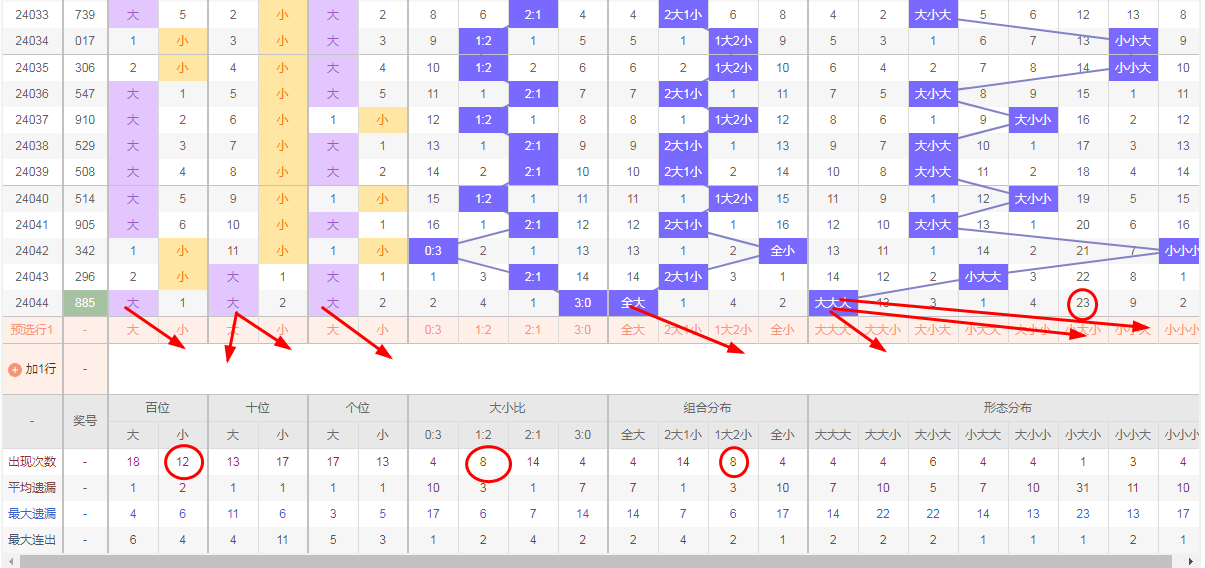 排列三 大小形态分析:从大小走势图上可以看出排列三100期内百位大小比为54比46,十位大小比为48:52,个位大小比为51比49除了十位偶数比奇数多,百位和十位都是奇数比偶数多。历史数据近3期开出小大大后下一期的走势为,第017期开出大大大 后第018期走大大大形态,第018期开出大大大 后第019期走小小小。第029期开出大大大 第030期开大大小。可以看出开出大大大 形态后形态转变过快,不过还是能看出开出大大大 形态后下一期还是比较规律的进行切换,这时遗漏数据就显示作用的时候,结合遗漏数据再加上开出大大大 形态后容易进行下一个类型变化。所以排列三第045期大小形态推荐2大1小。