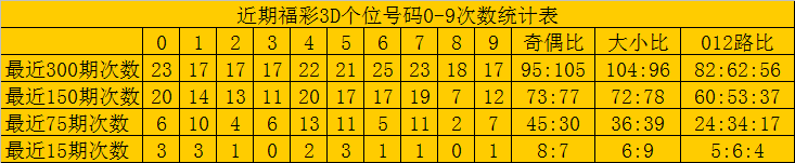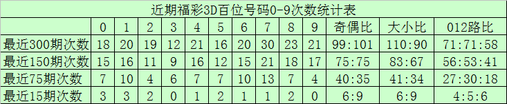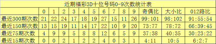 最近15期奖号由冷到热表现为:3、9→0次,4、6、7→1次,2、5、8→2次,0、1→3次,奖号奇偶比为6:9,大小比为6:9,012路比为4:5:6。