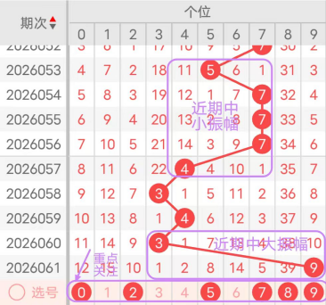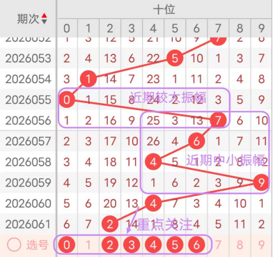 7期(055~061)开奖号十位号码球分别为0、7、6、4、9、4、2,开奖号与上一期走出的振幅分别为1、7、1、2、5、5、2。055期走出0号小数号码球,走出“1”的小幅度;056期走出7号大数号码球,走出“7”的大幅度,057期走出6号中大数号码球,走出“1”的小幅度,058期走出4号中小数号码球,走出“2”的小幅度059期走出9号大数号码球,走出“5”的中大幅度,060期走出4号中小数号码球,走出“5”的中大幅度,061期走出2号小数号码球,走出“2”的小幅度;从振幅大小及走势图的整体对应来看,中大振幅走在3~4之间较为适宜,中小振幅走在0~2之间较为适宜;结合走势图的上下对应及振幅大小分析,本期十位应重点关注号码球为0、2、3、4、5、6