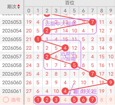 7期(055~061)开奖号百位号码球分别为1、4、2、5、7、9、4,开奖号与上一期走出的振幅分别为1、3、2、3、2、2、5。055期走出1号小数号码球,走出“1”的小幅度,056期走出4号中小数号码球,走出“3”的中小幅度,057期走出2号小数号码球,走出“2”的小幅度,058期走出5号中大数号码球,走出“3”的中小幅度059期走出7号大数号码球,走出“2”的小幅度,060期走出9号大数号码球,走出“2”的小幅度,061期走出4号中小数号码球,走出“5”的中大幅度;从振幅大小及走势图的整体形势,中大幅度走在3~5之间较为适宜,中小幅度走在1~2之间较为适宜;结合走势图的整体及大小走势分析,本期百位需重点关注号码球为1、2、3、5、6、7