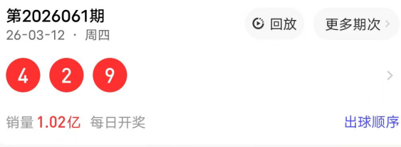 2026061期开奖号码为429,奇偶值为12偶;大小值为12小;012路走势为012路;跨度为7跨;和值15点;组六形态。