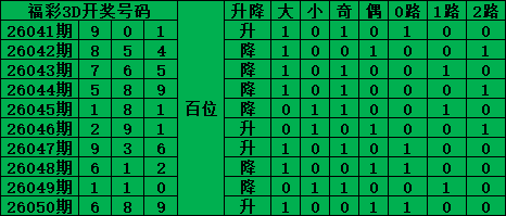 福彩3D是从0-9每期开出3个号码,截至2026050期三个位置最大遗漏的是43期的:百位的3号。