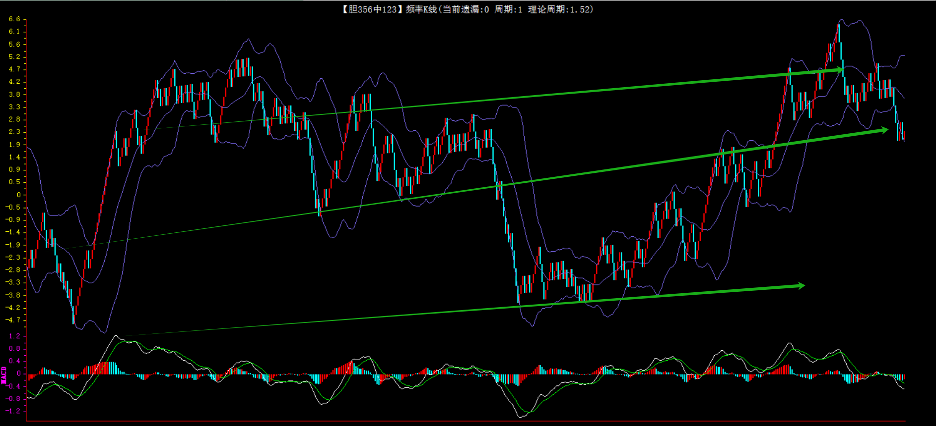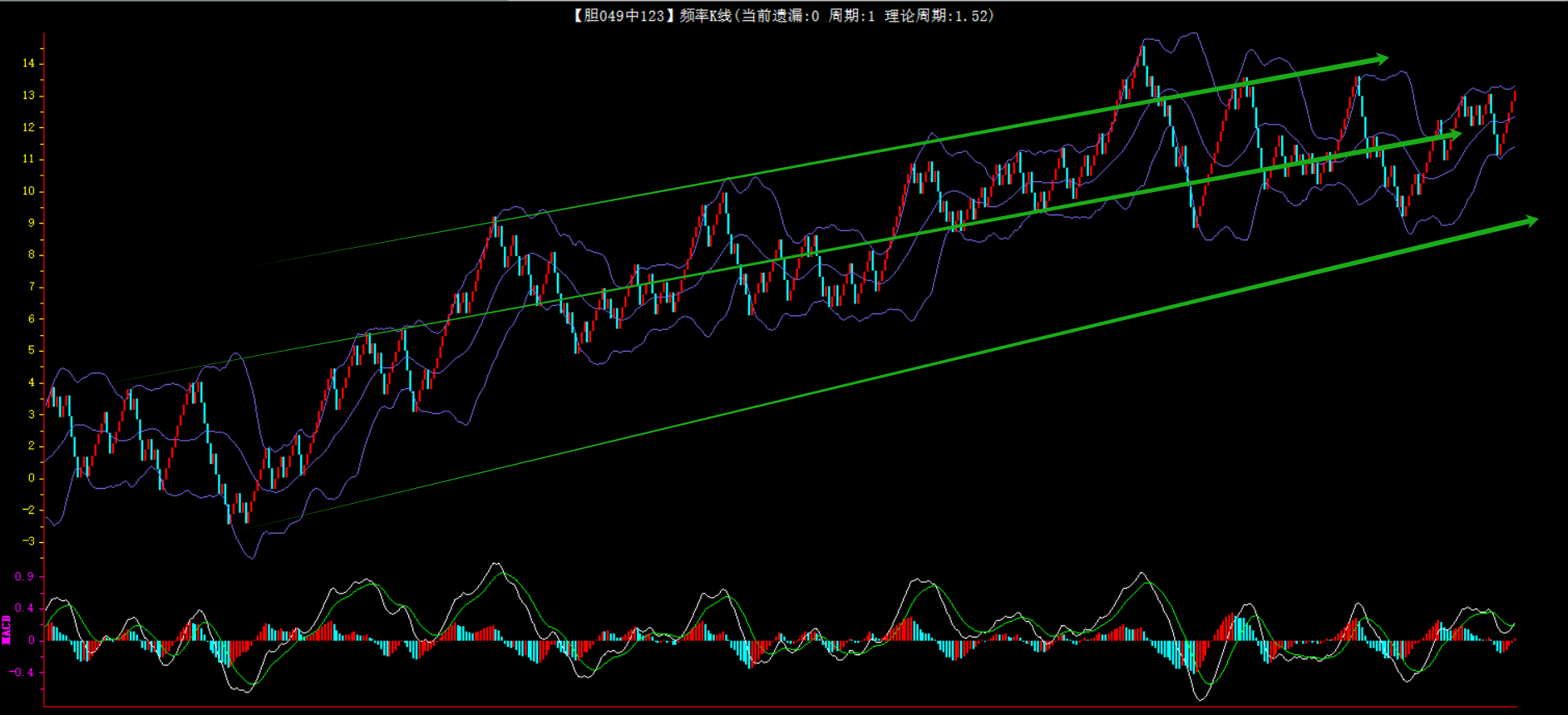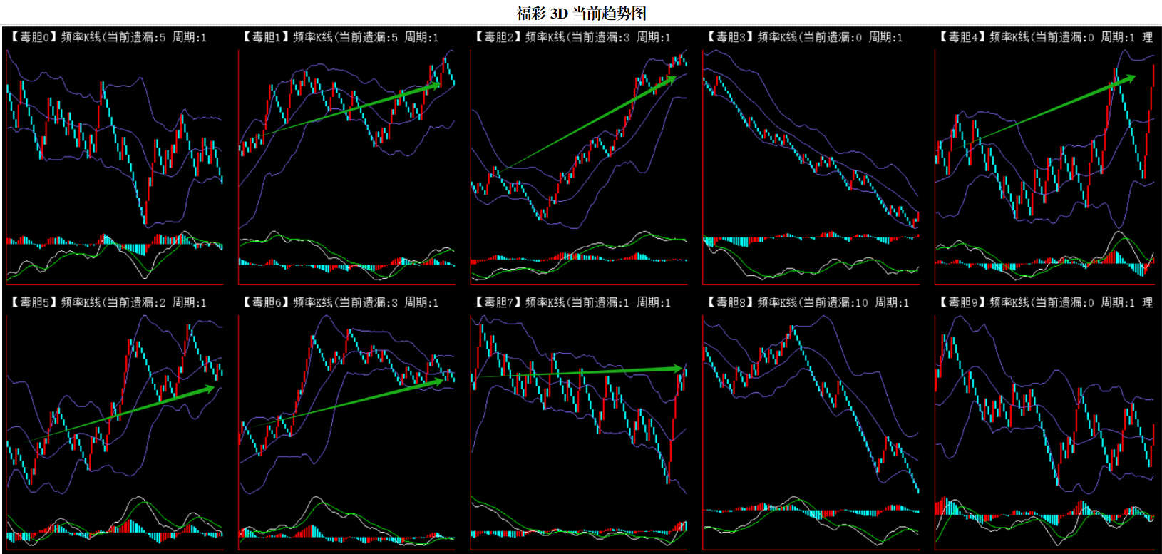 整体趋势上行,上边沿线趋势向上,下边沿趋势也是向上,节点震荡,当前遗漏1期,本期关注。