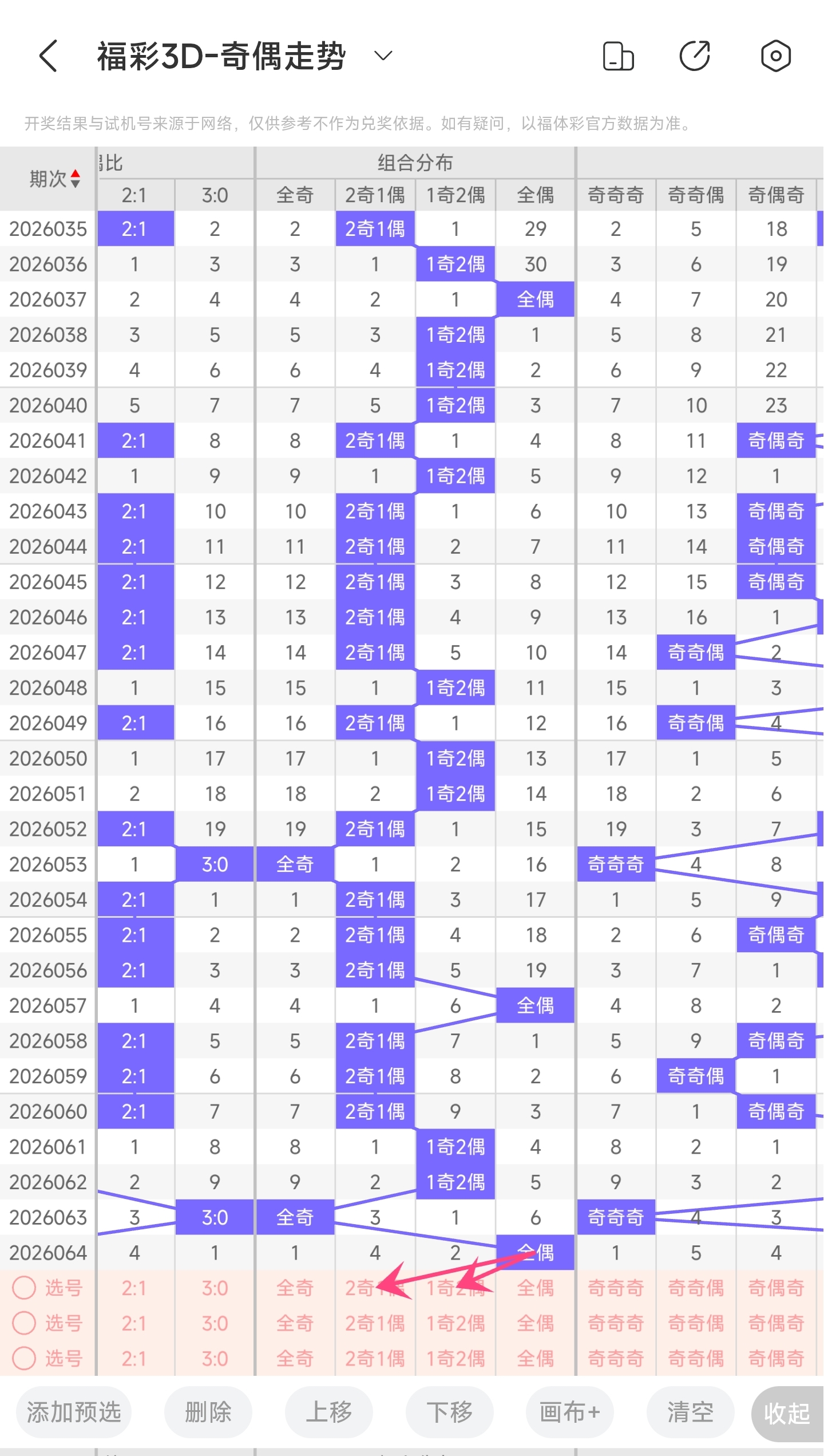 上期开了全偶的情况,往前一期开出的是1奇2偶。从组合数学理论上来讲,开出2奇1偶和1奇2偶的概率都为37.5%,开出全偶和全奇的概率为12.5%。通过分析目前30期内的数据。本期的开出全偶的概率是10%,开出全奇的概率为6.66%,开出1奇2偶的概率为33.33%,开出2奇1偶的概率是50%。和前一期相比,全偶概率变大,1奇2偶概率变小。通过走势图分析,上期开了全偶,推测本期可能开2奇1偶,其次是1奇2偶,然后是全奇或者全偶类型。