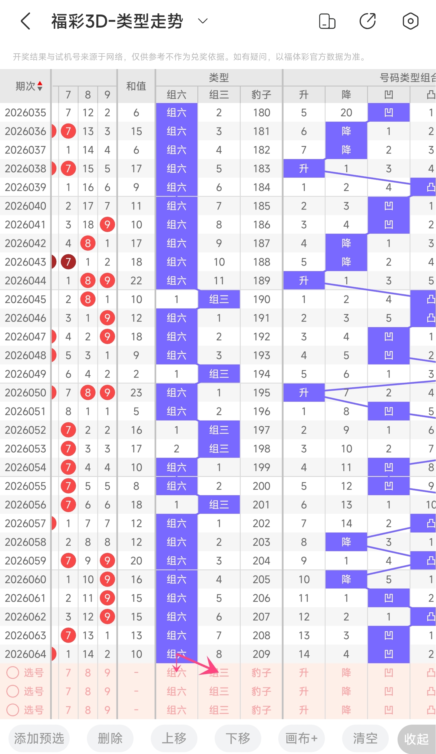 上期开出了组六类型,往前一期是组六类型。理论上开出组六的概率是72%,开出组三的概率是27%,开出豹子的概率是1%。通过分析目前30期内已经开出的概率,组六概率为83.33%,开出组三概率是16.66%。开出豹子的概率为0%。与前一期相比,概率没有变化。通过走势图可以看到上期开了组六,推测本期可能开组六,但要考虑组三可能回补了。所以推测本期大概率开组六,防开组三。
