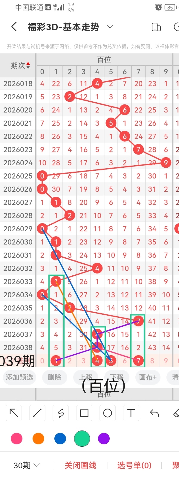 首先,为了感谢各位老板对小梁的关注和打赏,小梁特别提供一个杀个位的小技巧,同尾杀号法,准确率相还可以,但是要记住任何杀号都不能保证百分百准确的哦。小梁根据同尾杀号法,得知本期杀个位9。其次,小梁结合上图中的画线思路分析得出,号码0与前几期开出的号码呈隔期回补的走势且呈斜三连的走位,跨度7;遗落14期未出的号码1与前几期开出的号码呈斜三连的走势,跨度为6;号码4与前几期开出的号码呈斜三连的走势且呈隔八期回补的走位,跨度3;号码7与前几期开出的号码呈斜三连的走位且呈直连回补的走势,跨度是1。综上所述,小梁结合上图中画线的思路分析,本期推荐个位的号码是:0、1、4、7。